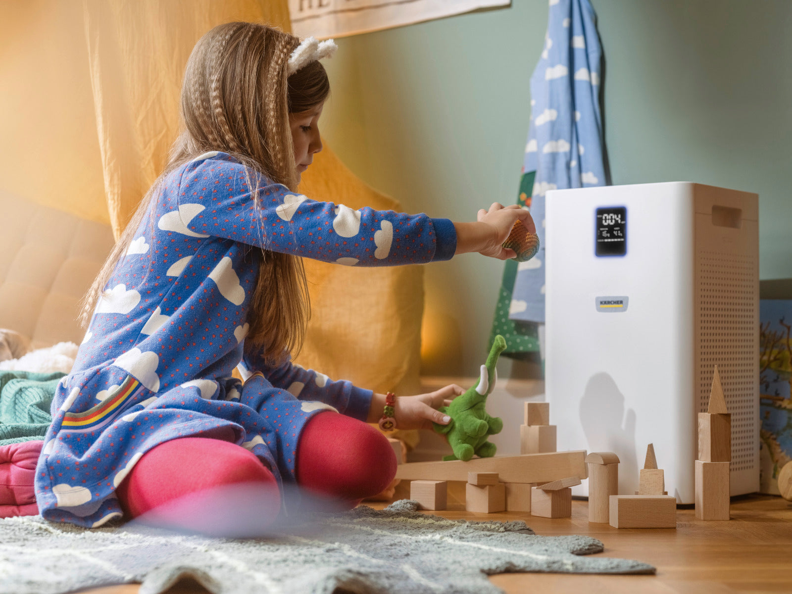 AF 30-luftrenaren med lasersensorteknik, automatiskt läge, display, H13-filtrering och aktivt kolfiltrering tar bort patogener, fint damm, allergener och lukter i rum från 30 till 60 m² stora.