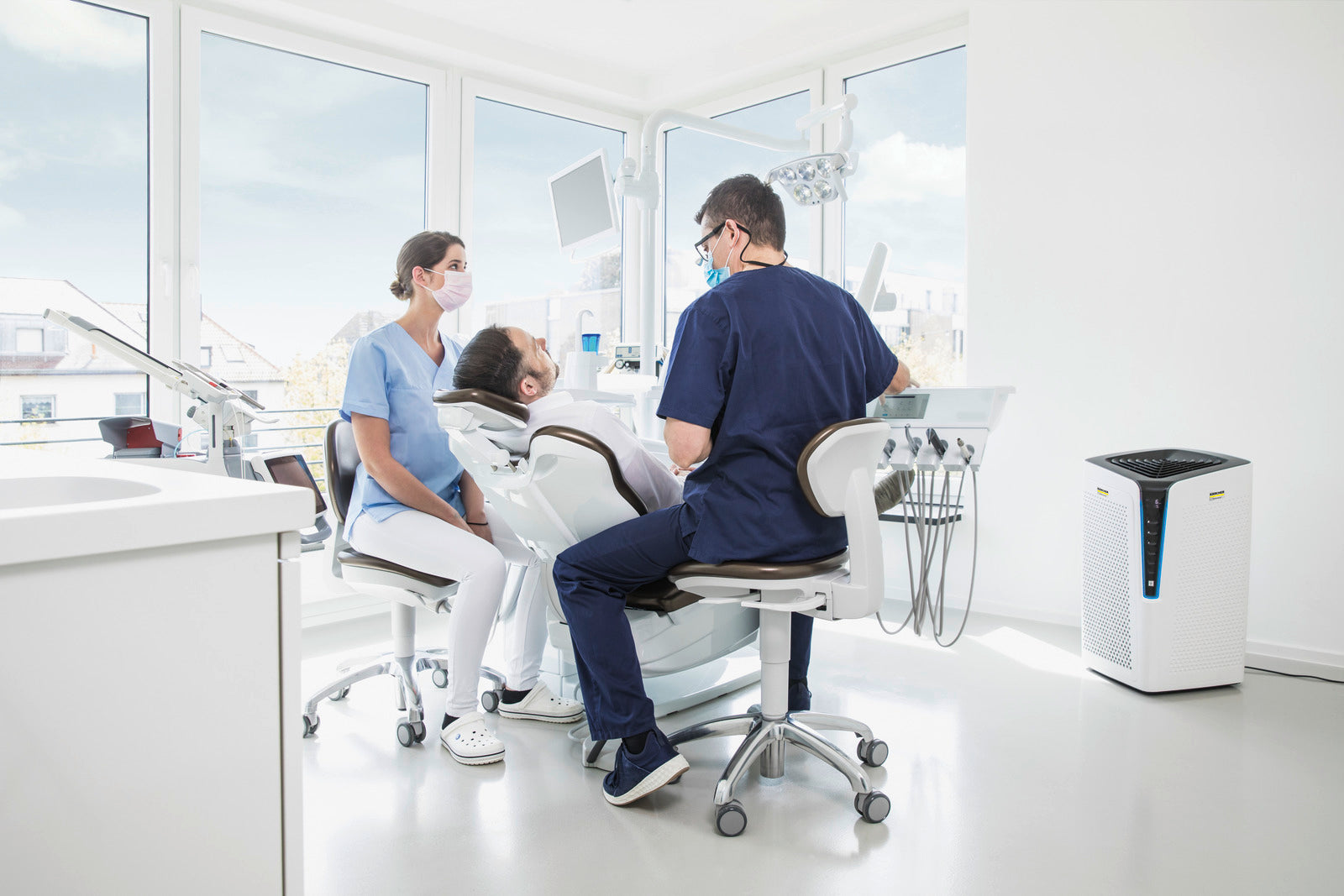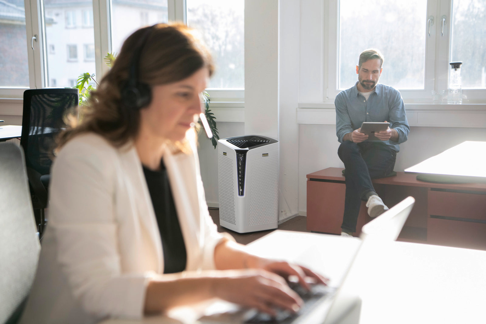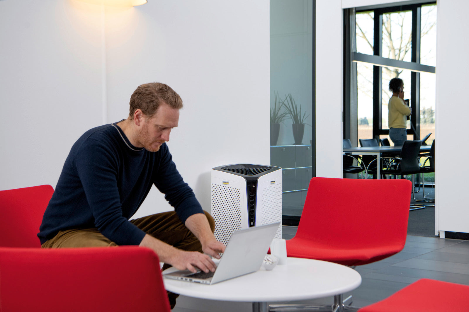 För att alla ska kunna andas fritt. För bästa möjliga luftkvalitet på arbetet: Kärchers luftrenare filtrerar bort virus, bakterier, allergener, dammpartiklar och lukt.