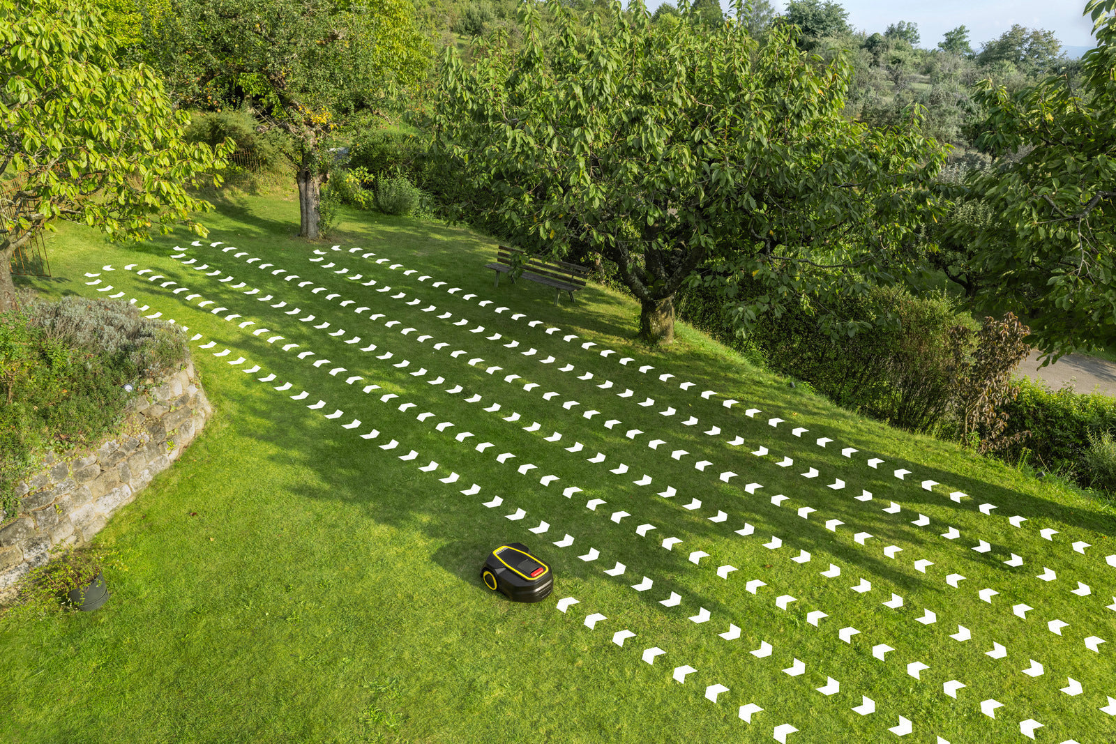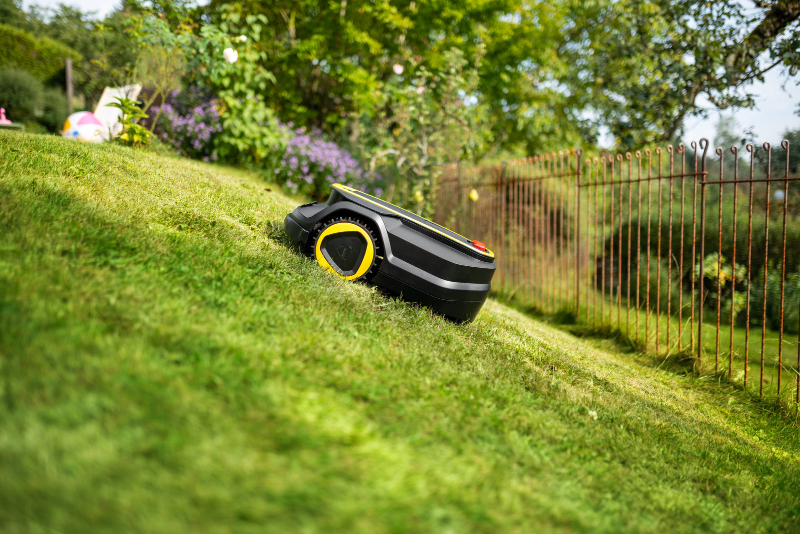 Robotgräsklipparen RCX 4 klipper gräsmattor på upp till 1 500 kvadratmeter helt automatiskt och utan behov av kablar. GPS, RTK-antennen och AI-kameran möjliggör navigering utan begränsningskablar. Exakt positionering gör det möjligt att klippa i parallella spår, vilket minskar klipptiden. Hinder som träd eller igelkottar identifieras och undviks intelligent på ett optimalt avstånd. Klipphöjden kan justeras variabelt mellan 2 och 6 centimeter. Robotgräsklipparen kartlägger arbetsområden via appen eller med AI-ytigenkänning. Arbetszoner och områden som ska undvikas (no-go-zoner) kan ställas in. Via appen kan du göra individuella inställningar för klippschema, körbeteende och mycket mer, för maximal bekvämlighet. All-wheel drive funktionen klarar sluttningar på upp till 60 procent och svänger särskilt försiktigt för att skona gräsmattan. Alla grundinställningar kan läsas av och justeras på LCD-displayen.