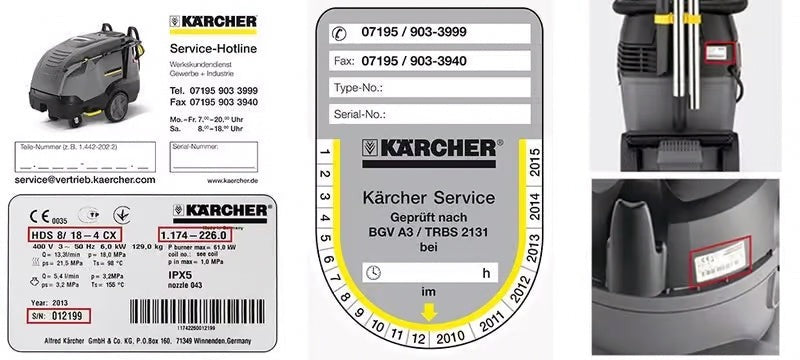 På typskylten hittar du både art.nr. och maskinbeteckning. Du hittar den på sidan av chassit eller under din maskin (HDS-S-klass i förvaringsfacket). Ring oss om du behöver hjälp att hitta skylten på din maskin.
