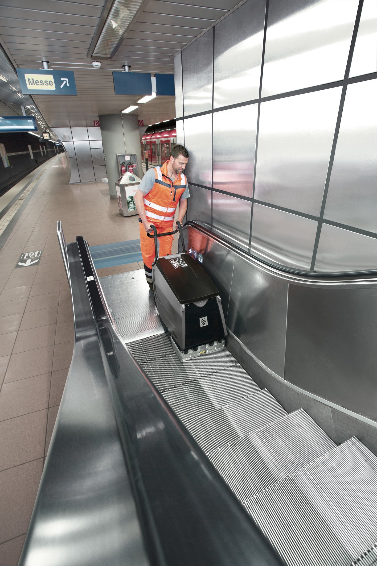 BR 47/35 ESC rengör snabbt och grundligt på rulltrappor och rullband, vare sig det handlar om grundrengöring eller underhåll. Rulltrappan rengörs när den är ingång. Den arbetar nära kanterna ända fram till det yttersta profilspåret.
