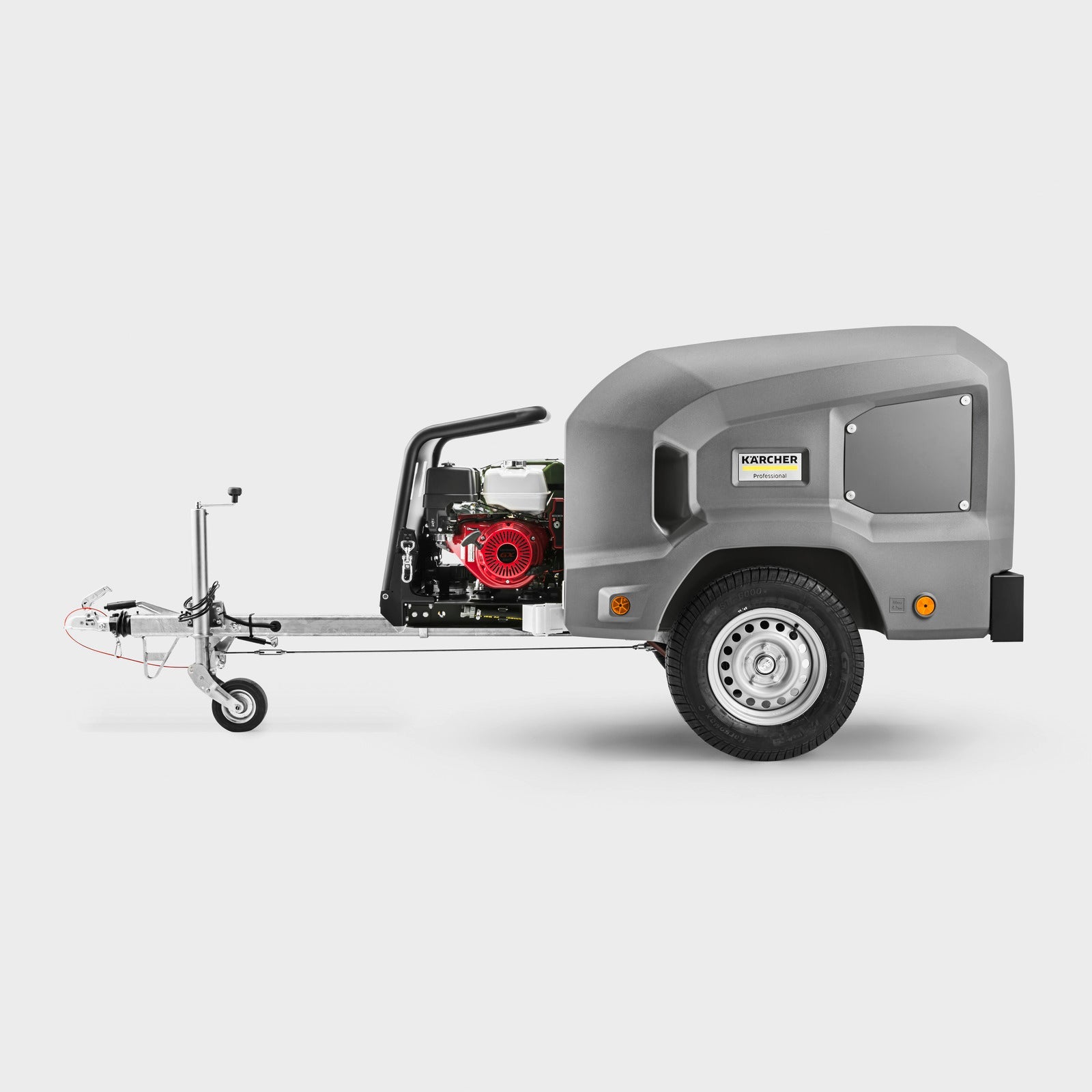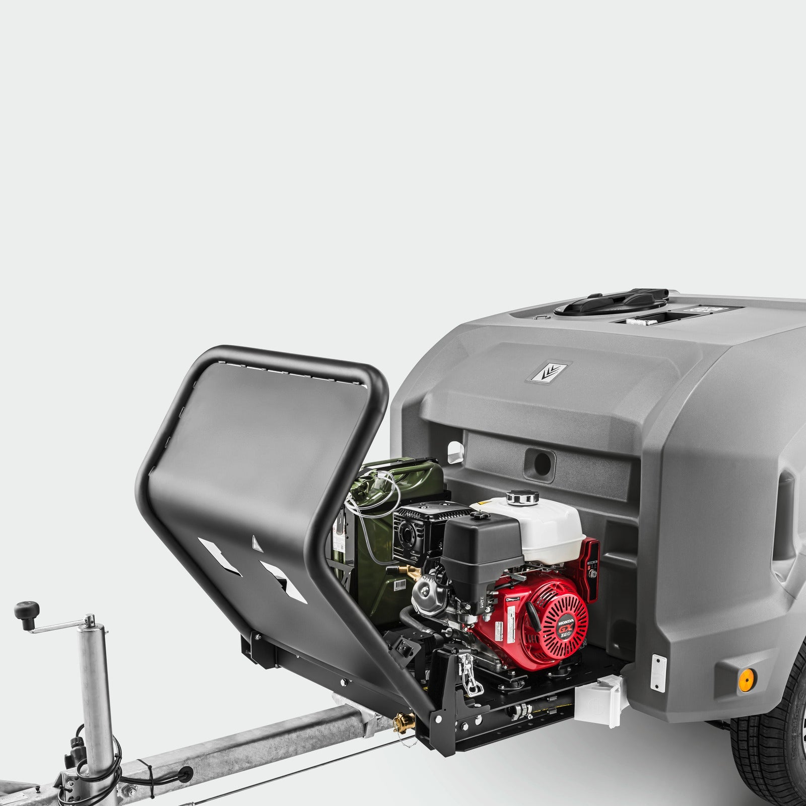 Mobil och fristående lösning för långa arbetspass med högtrycksrengöring på byggarbetsplatser och i kommunal verksamhet: HD Trailer HD 9/23 Ge Tr1 med Honda bensinmotor (EU STEG V) och 1 000 liters vattentank.
