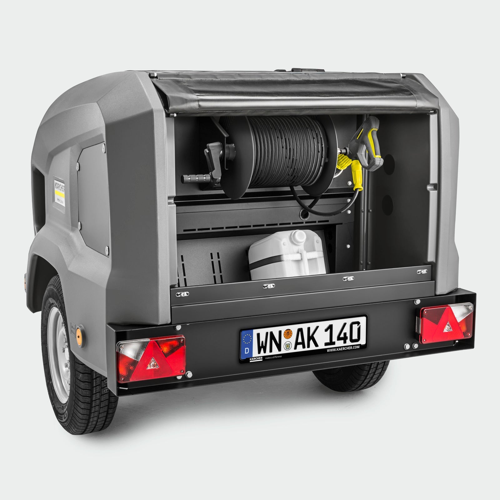 Vår mobila, ouppvärmda HD Trailer 9/23 De Tr1 är helt fristående tack vare en kraftfull, driftsäker och miljövänlig (EU STEG V) Yanmar dieselmotor och en vattentank på 1 000 liter. Med trailern utförs en mängd olika uppgifter med högtrycksrengöring som ofta förekommer i kommunal verksamhet eller inom byggsektorn på enklast tänkbara sätt. Med ett arbetstryck på 230 bar och en flödeshastighet på upp till 930 liter per timme finns praktiskt taget inga begränsningar. HD Trailer är som standard utrustad med ett ergonomiskt EASY!Force spolhandtag och många förvaringsmöjligheter. Denna robusta maskin är dessutom enkel att använda och finns i flera konfigurerbara varianter – till exempel med slangvinda baktill eller i en Cab-version (öppen variant).