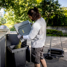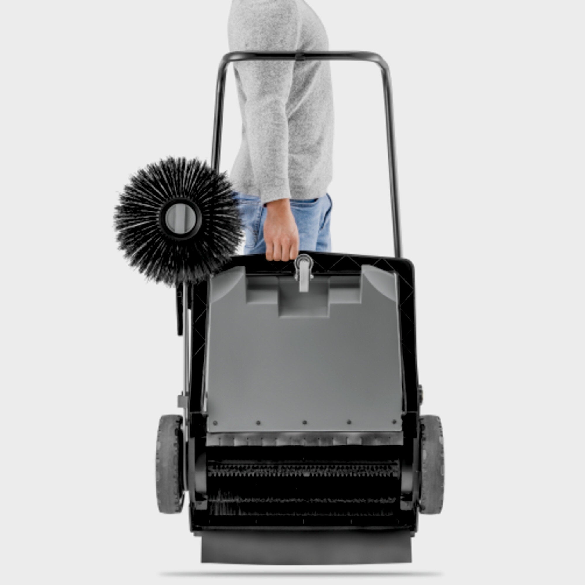 Med den kompakta KM 70/15 C Classic manuella sopmaskinen kan alla inomhus- och utomhusområden rengöras enkelt och bekvämt. Vid rengöring av områden på 100 kvadratmeter eller mer är den mycket mer effektiv än en sopborste. Den låga vikten och det låga rullmotståndet på hjulen gör den lätt att manövrera och transportera. Sopsvepvalsens drivs av det vänstra hjulet, vilket säkerställer pålitlig transport av skräp till sopbehållaren. Vid rengöring av öppna ytor kan den fällas upp ur vägen för att minska oönskad dammbildning. Sidoborsten kan justeras för att undvika slitage. Inga verktyg krävs vid byte av borsten. Skräpbehållaren kan tas bort och tömmas på ett ögonblick. Behållarens framkant är formad så att den kan ställas ner i upprätt läge när det behövs. Det fällbara körhandtaget kan justeras efter operatörens höjd och fälls helt ner för platsbesparande förvaring av KM 70/15 C Classic.