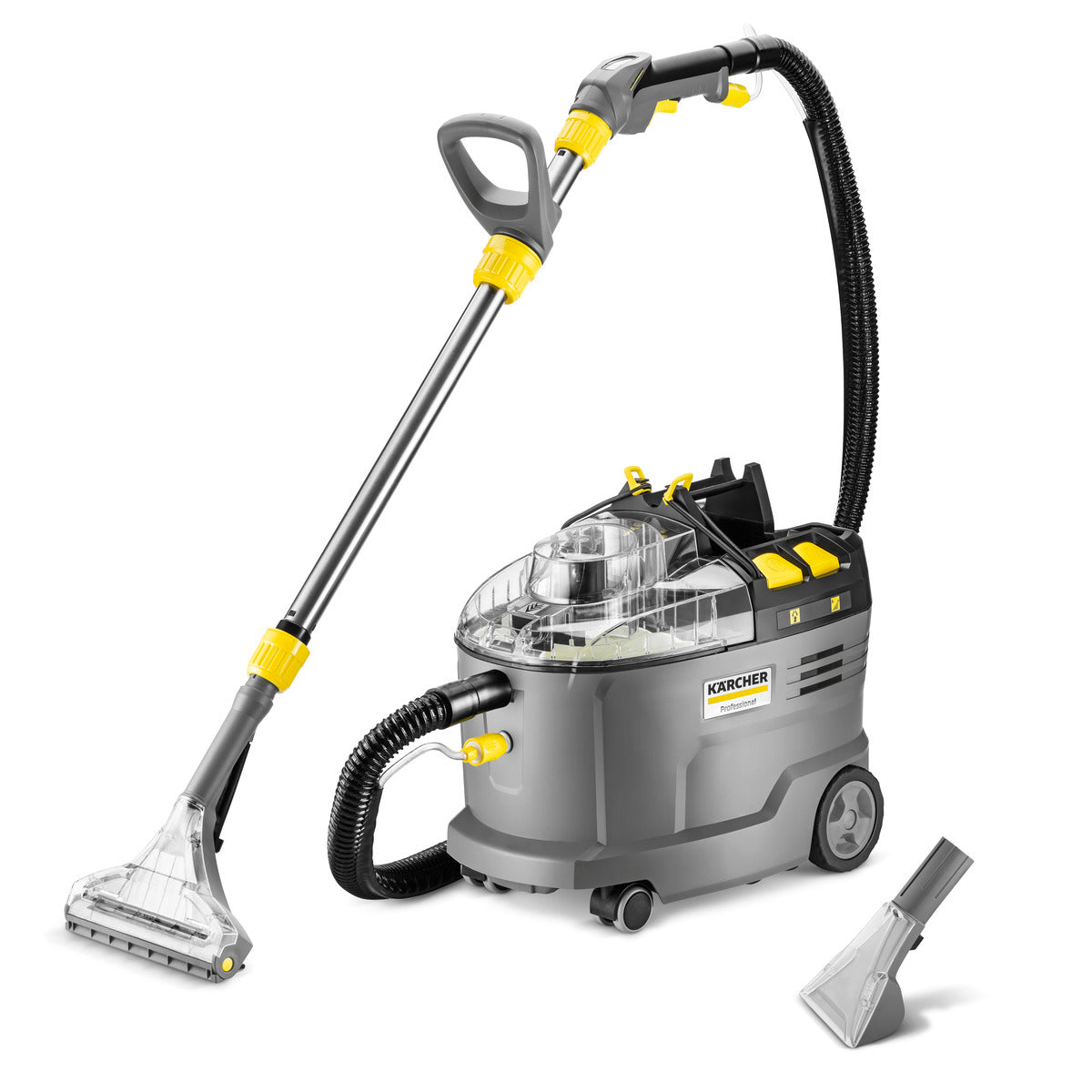 Den enda i sitt slag i världen, med en extremt robust design och trådlös flexibilitet: Vår Puzzi 9/1 Bp Adv Pack batteridrivna sprayextraktionsmaskin. Som den enda batteridrivna sprayextraktionsmaskinen på marknaden med professionell standard imponerar denna Puzzi alltid med sin exceptionella prestanda och maximal rörelsefrihet vid djuprengöring av klädsel, mattor och andra textilområden inom alla branscher, vare sig det gäller hotell eller gästfrihet, fordonstvätt eller byggstädning. Trots sin kraft är denna Puzzi extremt tyst, vilket gör den idealisk för användning på allmänna platser. Dessutom gör det ergonomiskt utformade handtaget det enkelt att bära med en hand. För bästa rengöringsresultat trycks rengöringslösningen in i textilfibrerna och sprayas djupt, för att sedan sugas upp tillsammans med det lösa smutsen. Medföljer som standard: Möbelmunstycke, spray/sugslang, golvmunstycke, sugrör, 2-i-1-behållare för rent och smutsigt vatten, integrerad förvaring för tillbehör och mycket mer. När du beställer den här maskinversionen, kom ihåg att det kraftfulla 36 V Kärcher Battery Power+ batteriet och den motsvarande snabbladdaren måste beställas separat.