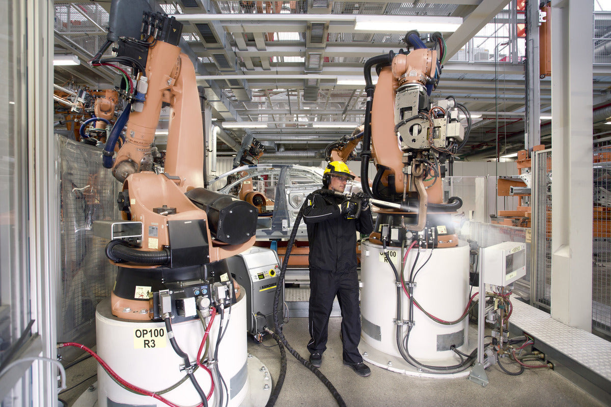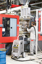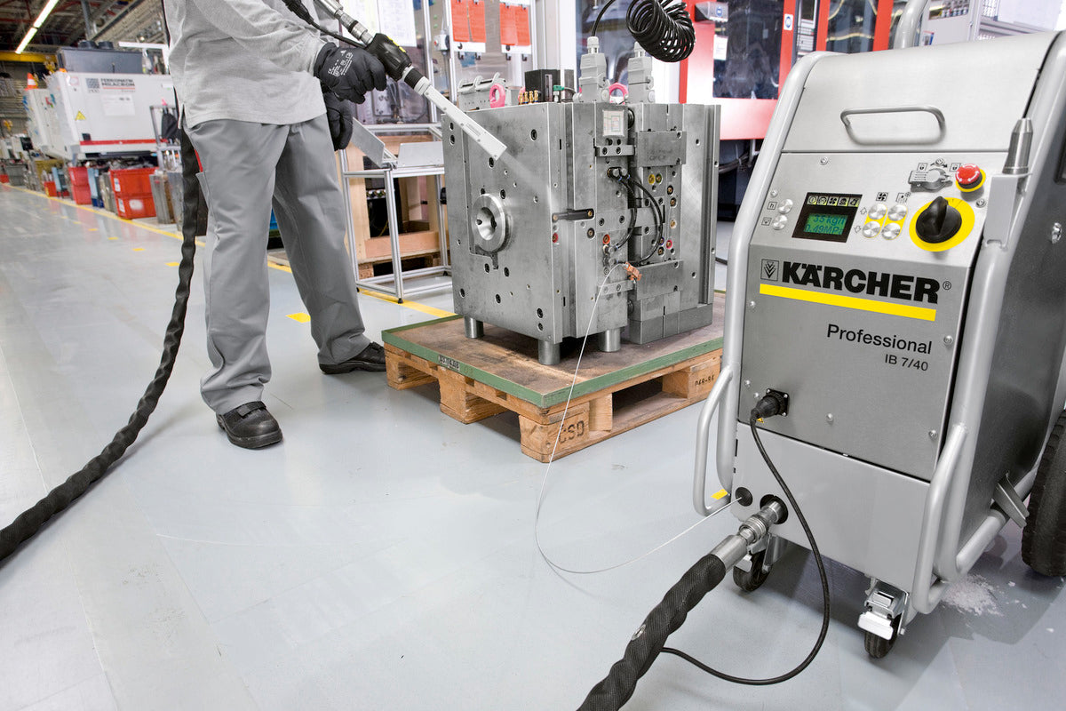 Kärchers första isblästringsmaskin, IB 15/80, är avsedd för högeffektiv rengöring och restaurering av en mängd föremål och ytor. Den nya, lättare och mer kompakta IB 7/40 har många av den större maskinens fördelar men kräver mycket mindre tryckluftsförsörjning, vilket gör den idealisk för användning tillsammans med interna tryckluftssystem. Kärchers torrisblästringsteknik är en icke-aggressiv men noggrann metod för rengöring av verktyg, formar, ytor och maskiner med minsta möjliga stilleståndstid. Torrispellets förs in i en tryckluftsström som skjuter iväg dem i en hastighet på över 150 m/s mot den yta som ska rengöras. Den snabba nedkylningen av ytan orsakar en termisk chock och skapar fina sprickor i det översta skiktet. Torrisen tar sig in i dessa sprickor, lyfter upp smutsen från ytan och återgår till atmosfären i form av CO-gas så att endast smutsen blir kvar. Vid isblästring används inga kemikalier. Det genererar inget spillvatten, är miljövänligt och kan användas på platser där rengöring med vatten är förbjuden eller opraktisk. Kärchers torrisblästringsteknik är en icke-aggressiv men noggrann metod för rengöring av verktyg, formar, ytor och maskiner med minsta möjliga stilleståndstid. Torrispellets förs in i en tryckluftsström som skjuter iväg dem i en hastighet på över 150 m/s mot den yta som ska rengöras. Den snabba nedkylningen av ytan orsakar en termisk chock och skapar fina sprickor i det översta skiktet. Torrisen tar sig in i dessa sprickor, lyfter upp smutsen från ytan och återgår till atmosfären i form av CO-gas så att endast smutsen blir kvar. Vid isblästring används inga kemikalier. Det genererar inget spillvatten, är miljövänligt och kan användas på platser där rengöring med vatten är förbjuden eller opraktisk.
